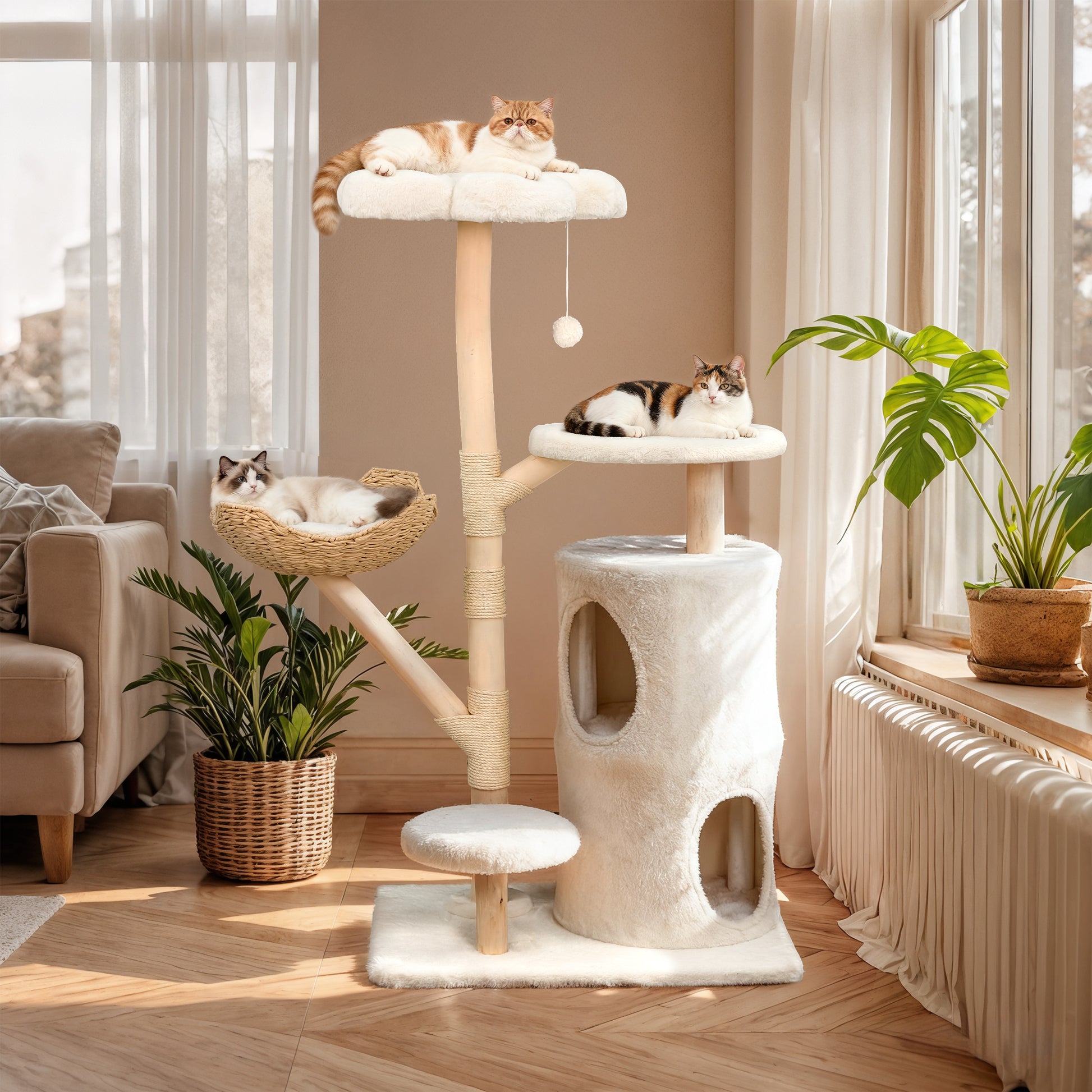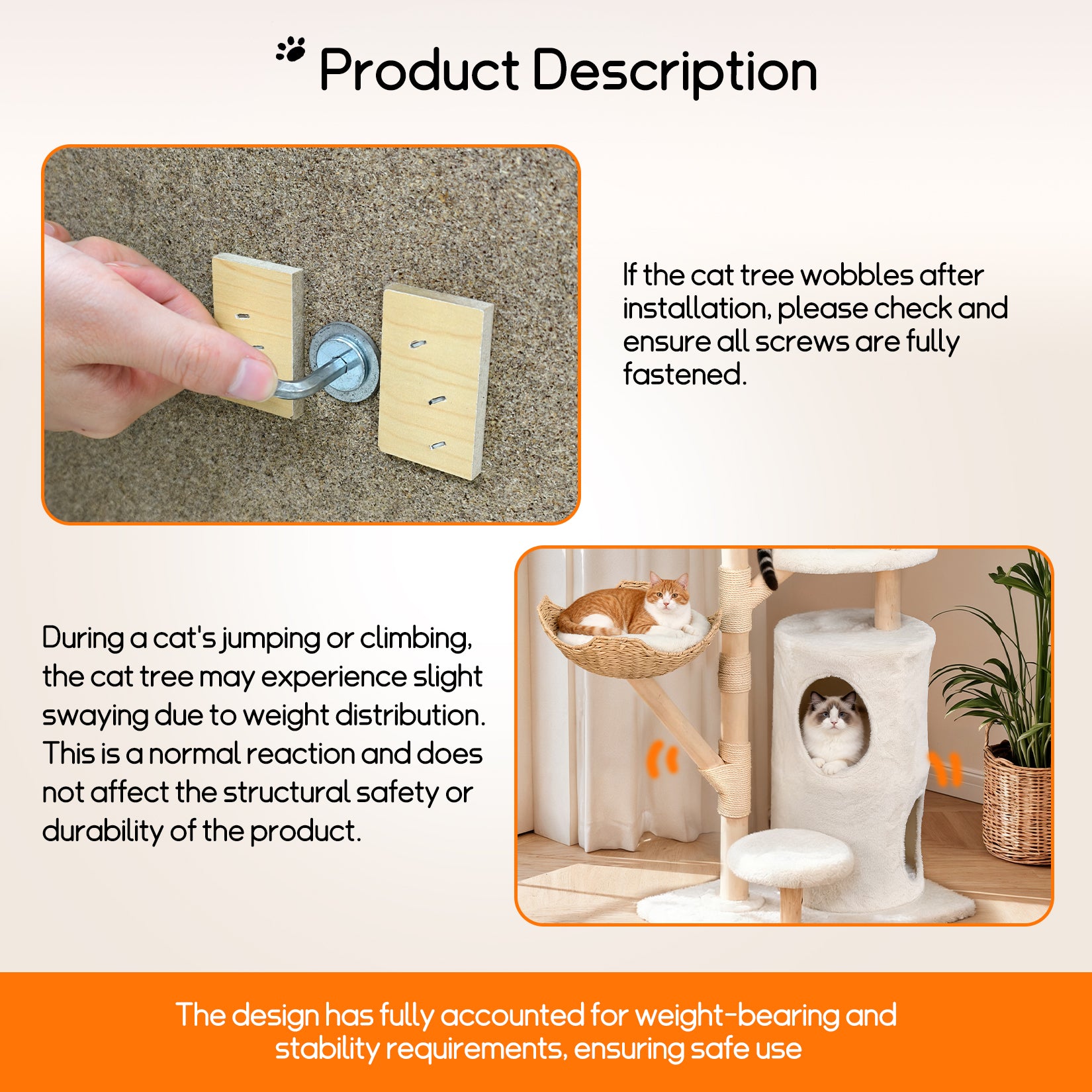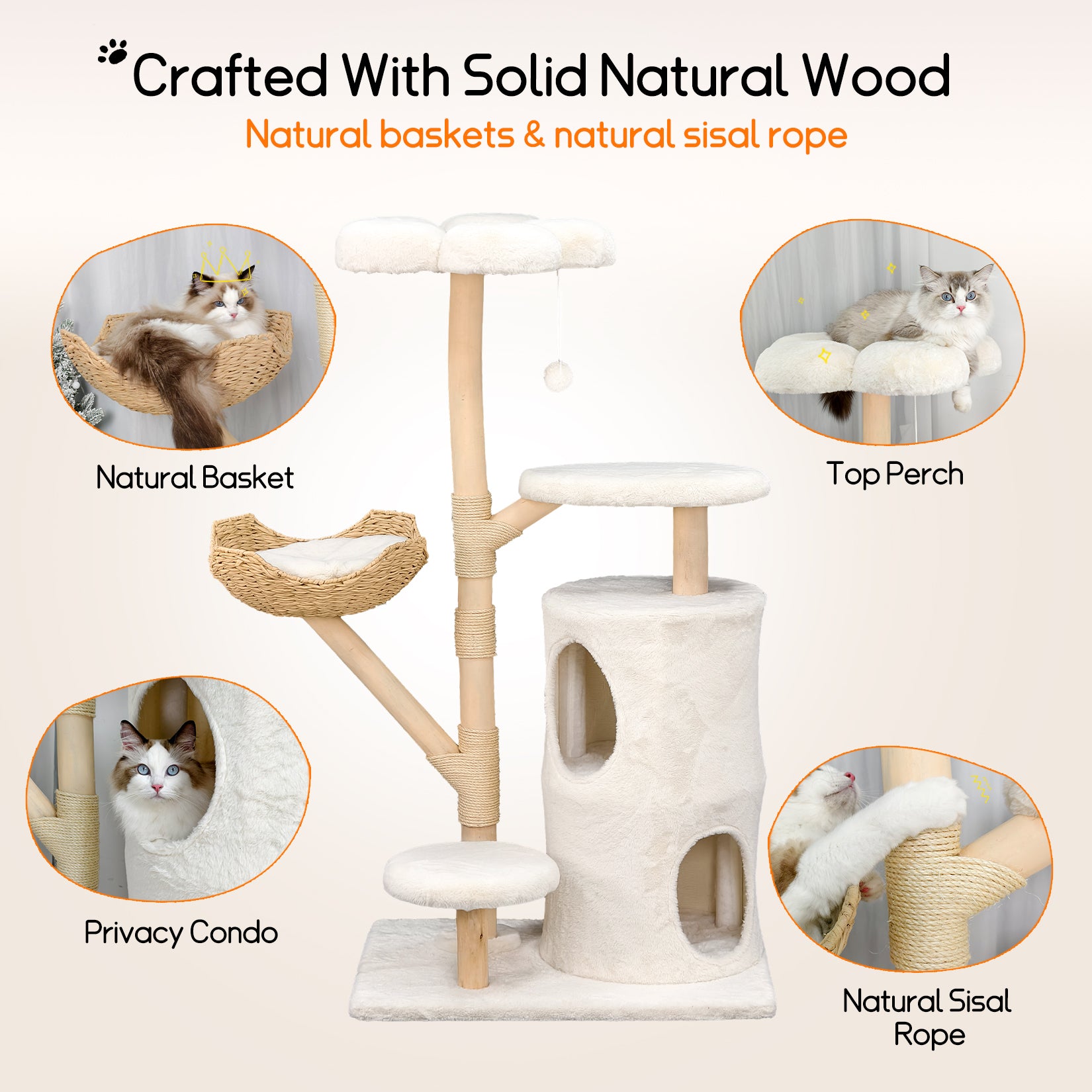 【Cat-friendly Cat Tree】Artfully designed in the shape of a tree, this indoor cat tower combines white accents with warm tones of natural wood, blending natural aesthetics with feline functionality, makes it a beautiful piece of furniture, the structure includes two plush-lined condos for private retreats, a cushion top perch for panoramic views, two platforms for jumping, and a rattan basket that adds textures and comfort, perfect for both single and multi-cat households, allows to climb, lounge, play simultaneously without disturbing one another