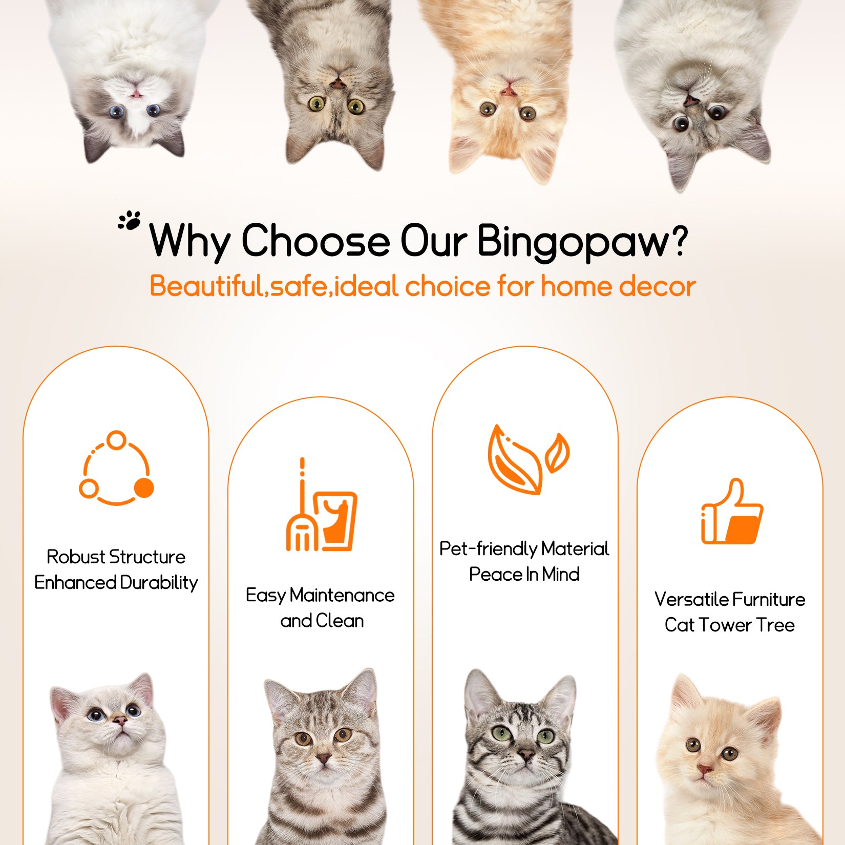 【Multiple Resting Spots】Bingopaw cat tree tower is crowned with a plush, cushioned perch on top, shaped like a delicate flower, creating a comfortable spot where cats can rest while surveying the surroundings from high above, this elevated position not only satisfies their natural instinct to observe but also provides a sense of control, security, and relaxation, also incorporating two cozy hideaway condos offer private sanctuaries for napping, lounging, or retreating in peace, giving your feline companions a perfect balance of seclusion and comfort