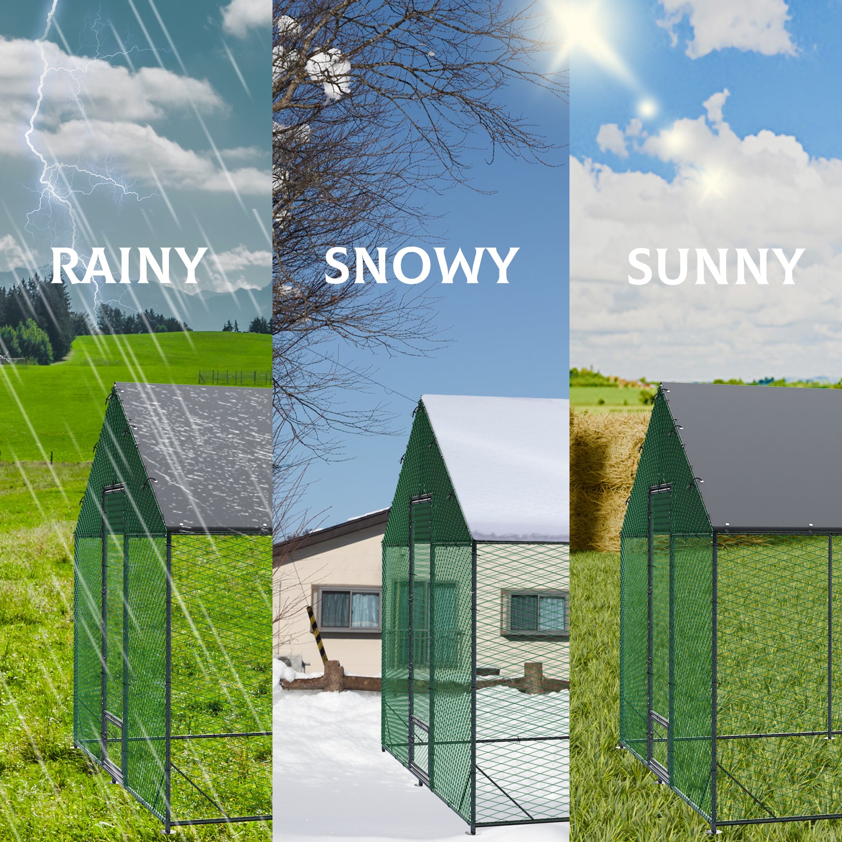 【Sunshade Cover】Poultry are timid and easy to be frightened, be afraid of thunders and rains, they will run for cover either back to the coop if it rains, our coop features a shelter cover on the top, the first cover that crafted from solid 600D oxford cloth with special stitching for reinforcement, UV-resistant and anti-aging, waterproof and heat insulation, effectively protects chickens from sun, rain or snows, easily fixed them with cable ties, very large coop space great for raising any chickens, ducks, gooses, turkeys, peacocks in your farm yard, dirty-resistant cover easy to clean