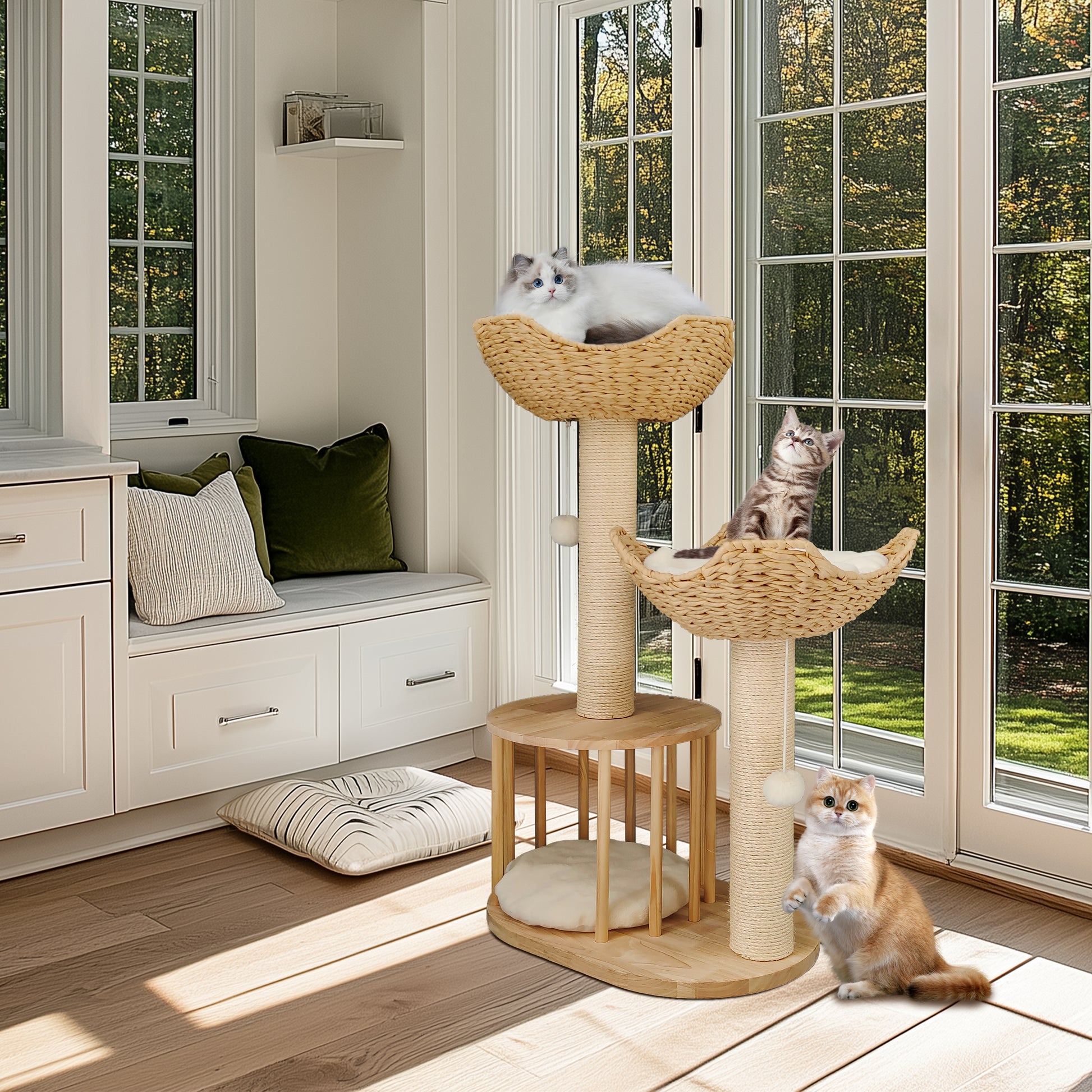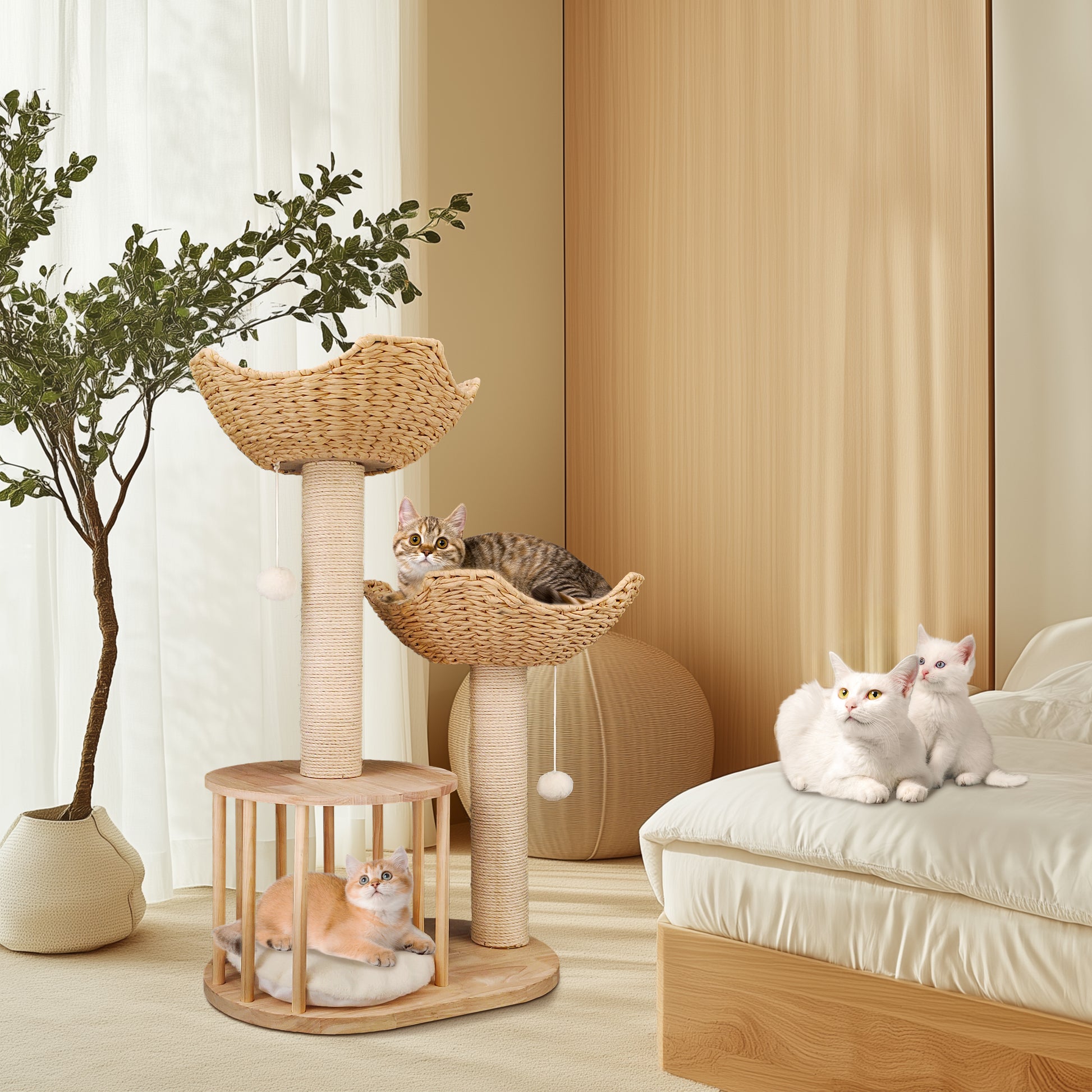 Well-designed Cat Tree38.98 inches tall cat activity centre, it features two baskets and one condo, both are with plush cushion pads inside, easy to remove for cleaning, creating cozy spots for cats to lounge, curl up and rest, the sisal-covered post satisfies cats' instinctive need to scratch, saving your furniture from their paws, incorporating dangling balls attached on the baskets for more entertainment and prevent boredom