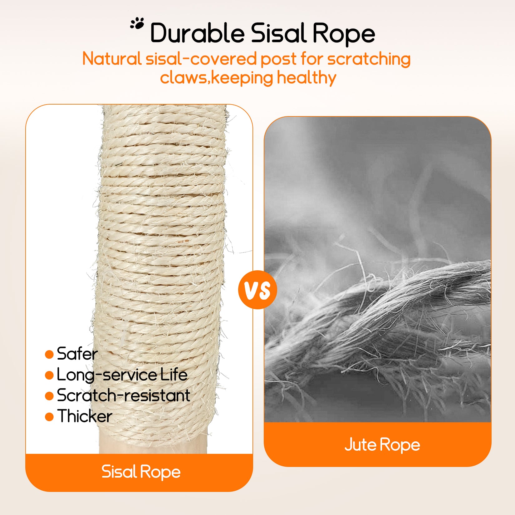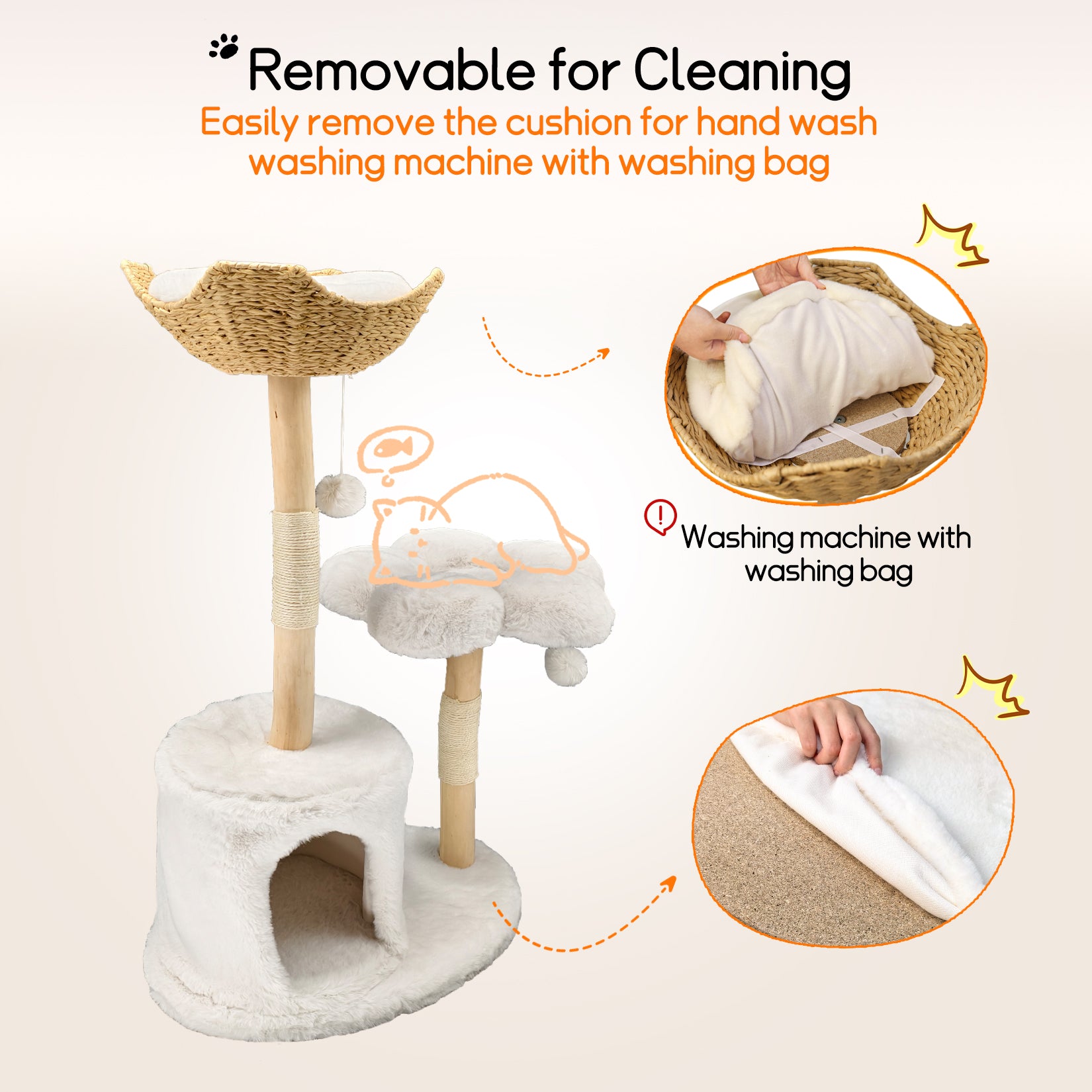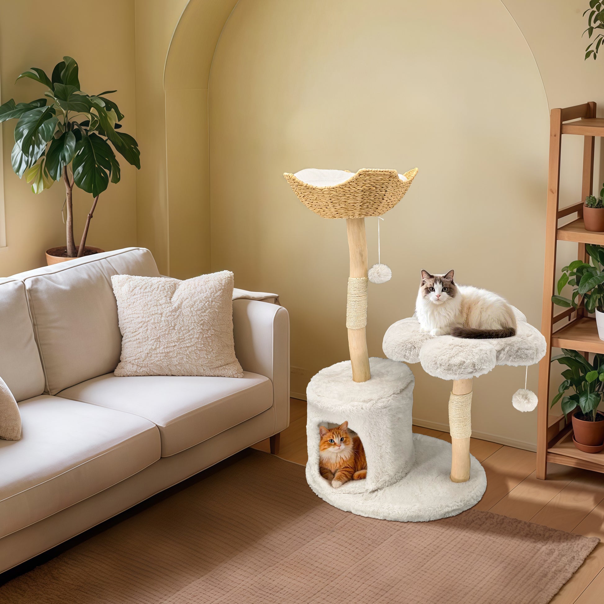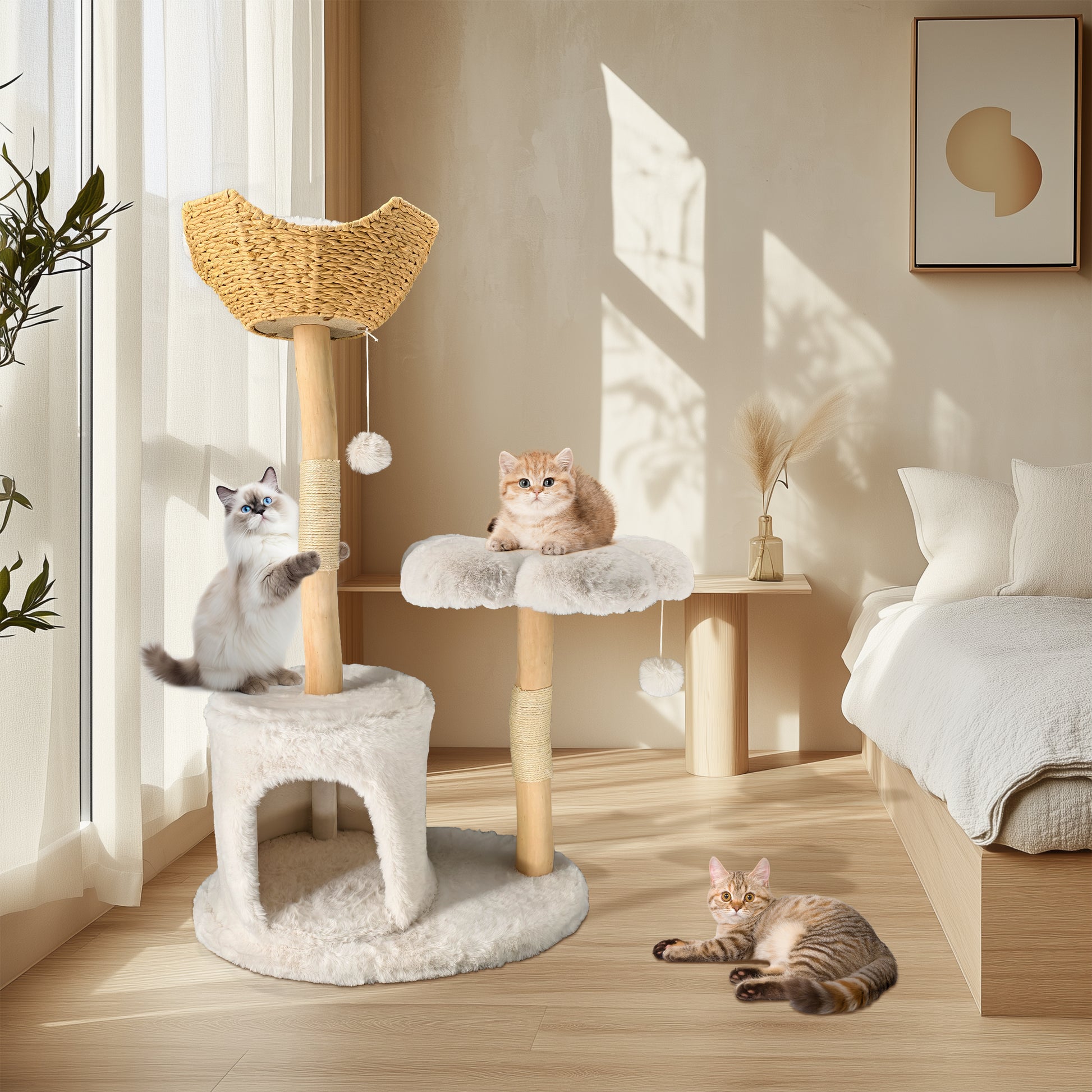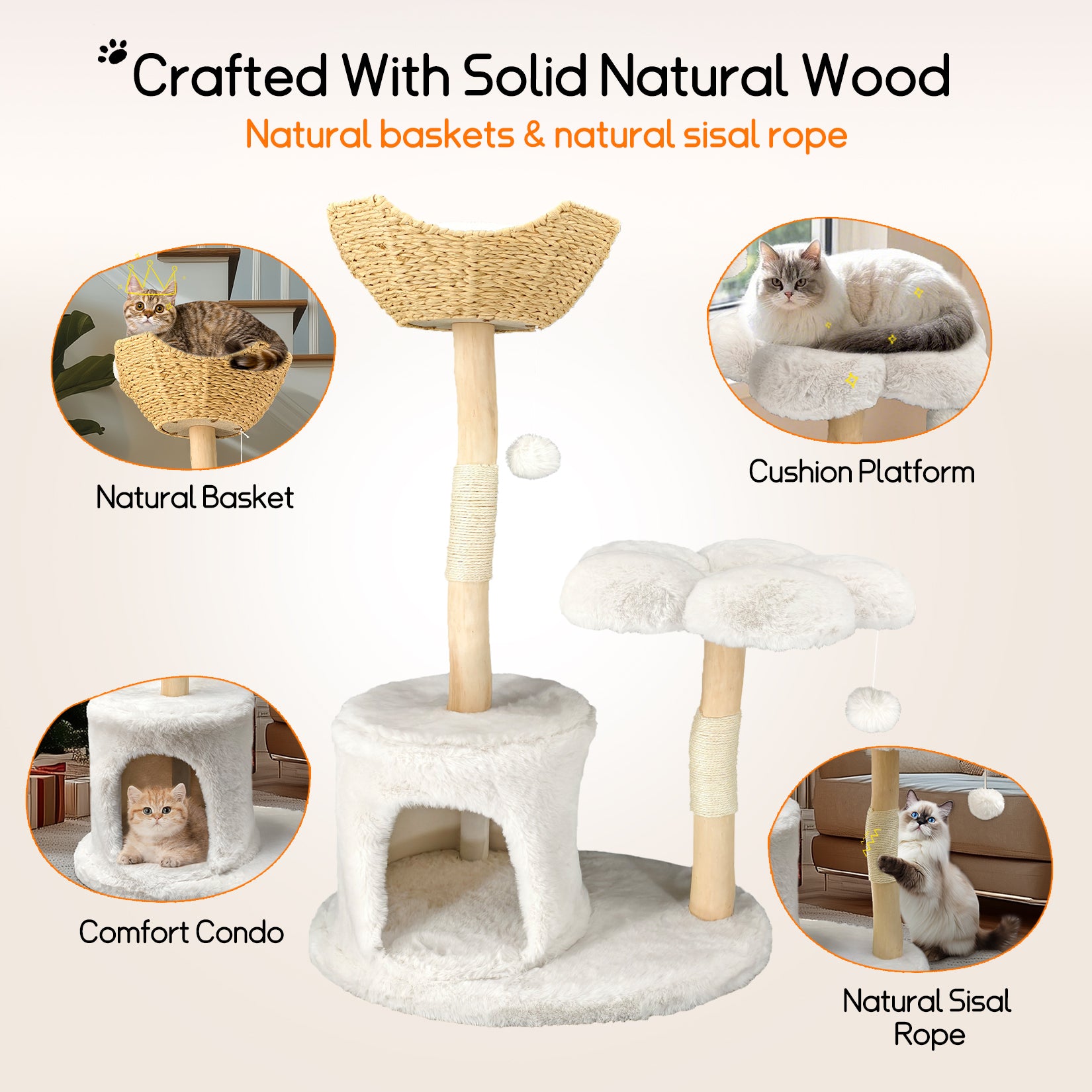 Well-designed Cat Tree38.98 inches tall cat activity centre, it features a top basket, a flower perch platform and condo beneath, all are with plush cushion pad to provide warmth and comfort for lounging and relaxing, the two sisal-covered post not only satisfies their natural instinct to sharpen claws, maintains claws health, but also saving your furniture from their paws, incorporating two dangling balls on encourage playful engagement and prevent boredom