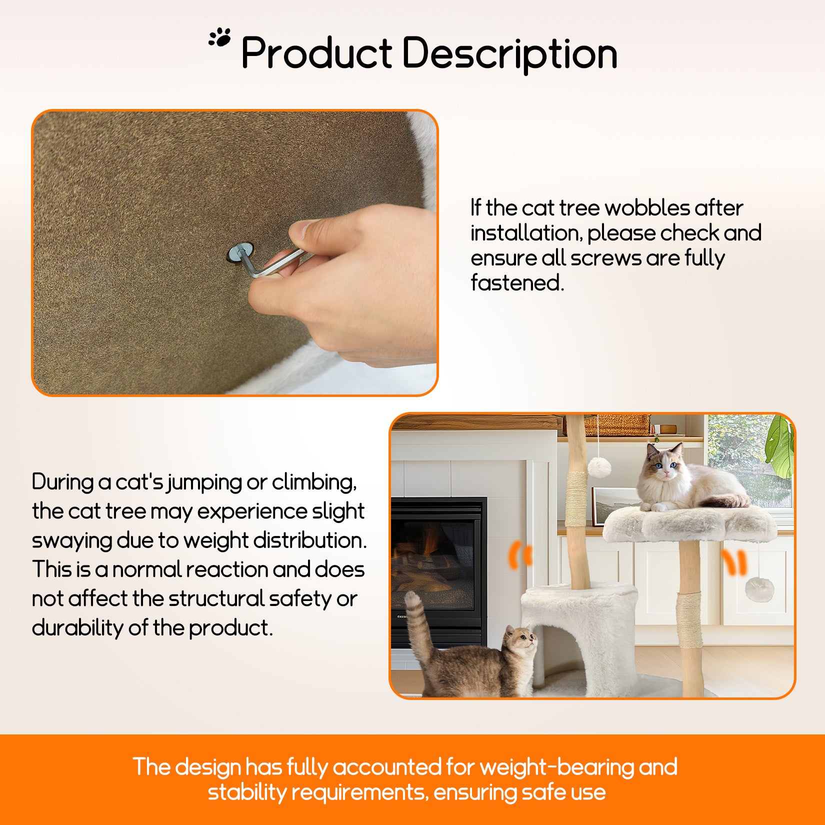 Stable StructureBingopaw cat tree is designed with a large, reinforced base that provides exceptional stability, crafted of particle board that renowned for its strength and durability, ensures anti-deformation and long-lasting, the robust construction is engineered to stand the wear and tear that with daily climbing, jumping, making it a reliable and durable addition to any homes, upgraded screws are used throughout the assembly process and added safety