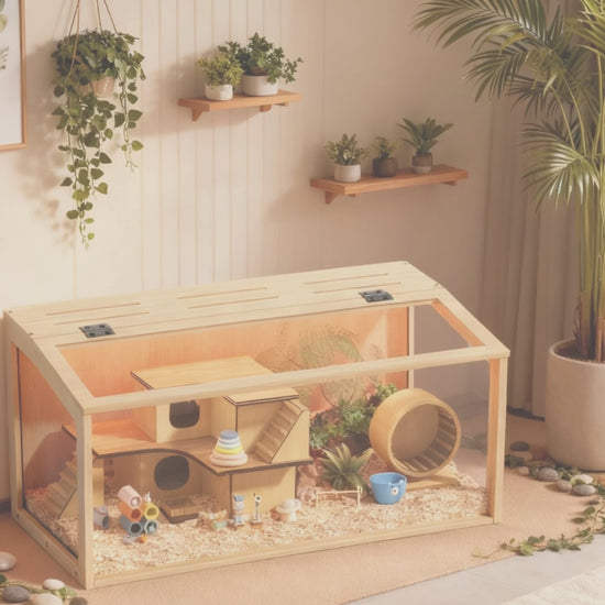 【Open & Bright Habitat】This hamster cage is crafted with a perfect blend of natural wood and tempered glass, offering not only durability also modern organic aesthetic, creating an open, transparent visual effect and bright, well-lit living environment that reduces feelings of stress and confinement of hamsters, enhances their comfort, the warm wooden elements add natural touch, softening the overall look, while the sleek glass delivers a clean, sleek appeal that seamlessly integrates into any interiors