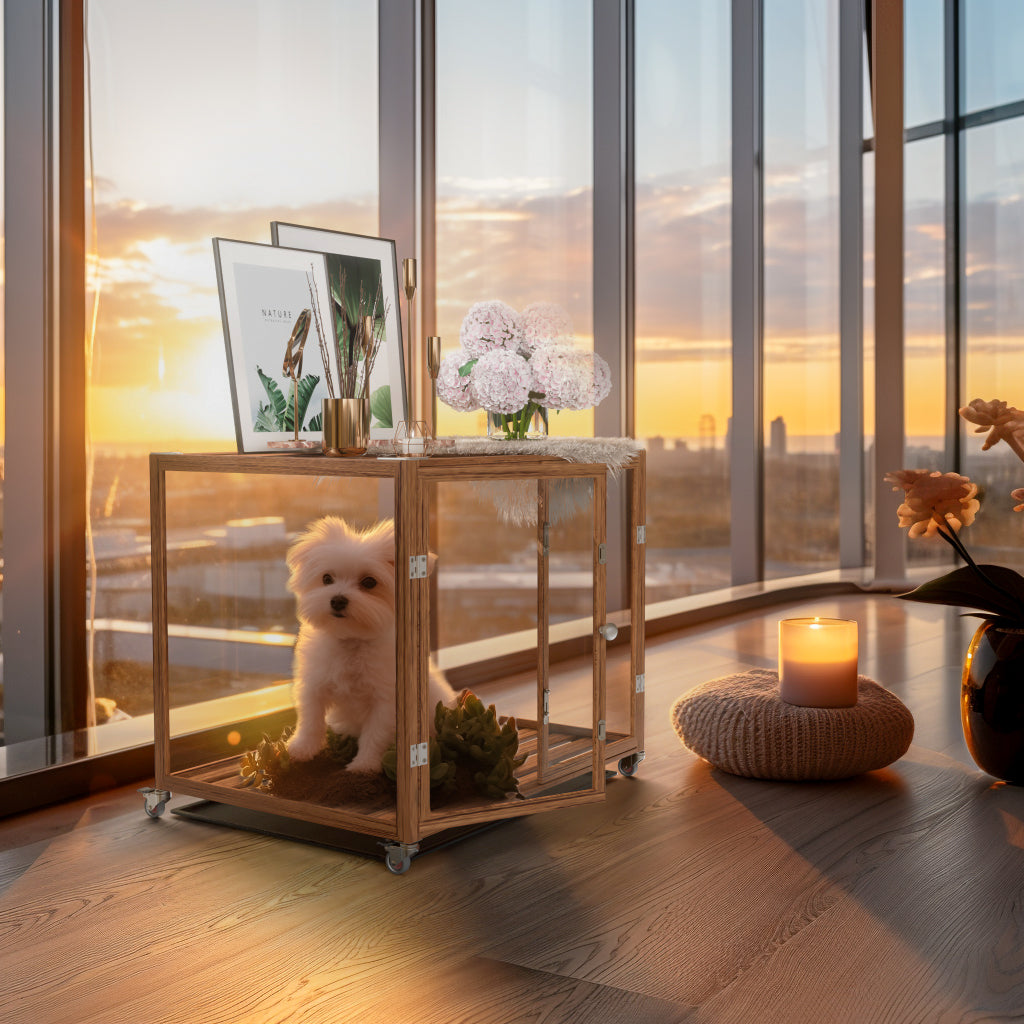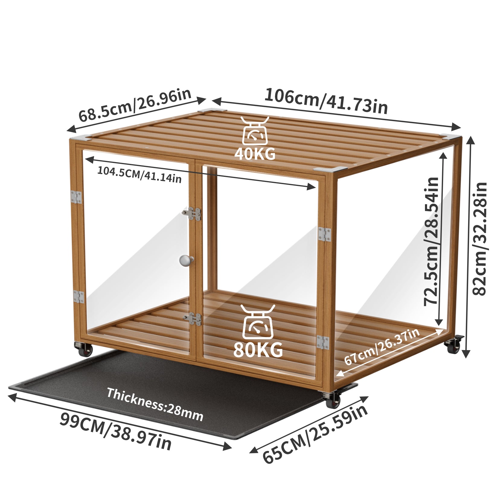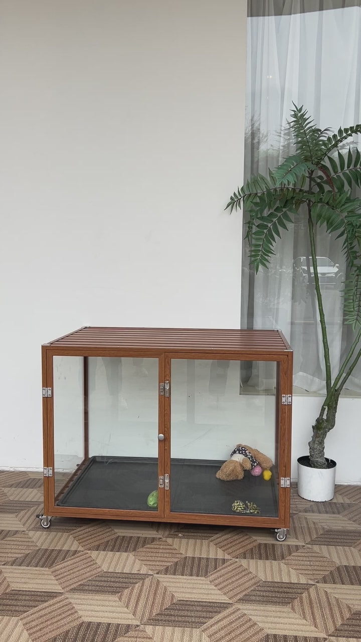 DIY Stylish Pet Cage For Dogs - Our new design pet cage are available in three sizes option, M size (29.92x23.03x26.18 inches), L size (35.43x24.01x29.72 inch) and XL size (41.73x26.96x32.28 inches), large interior space for small to large dog breeds, cats, it provides a safe and secure spot for pets to stand, turn around, lie down comfortably, the perfect blend of wood grain aluminum frame with clear tempered glass, it boasts a minimalist look, fits for most home styles, the surface enables you and your kids DIY painting or led fairy lights on the top for added an ambiance, giving a more inviting home for pets, easier to wipe clean with a cloth