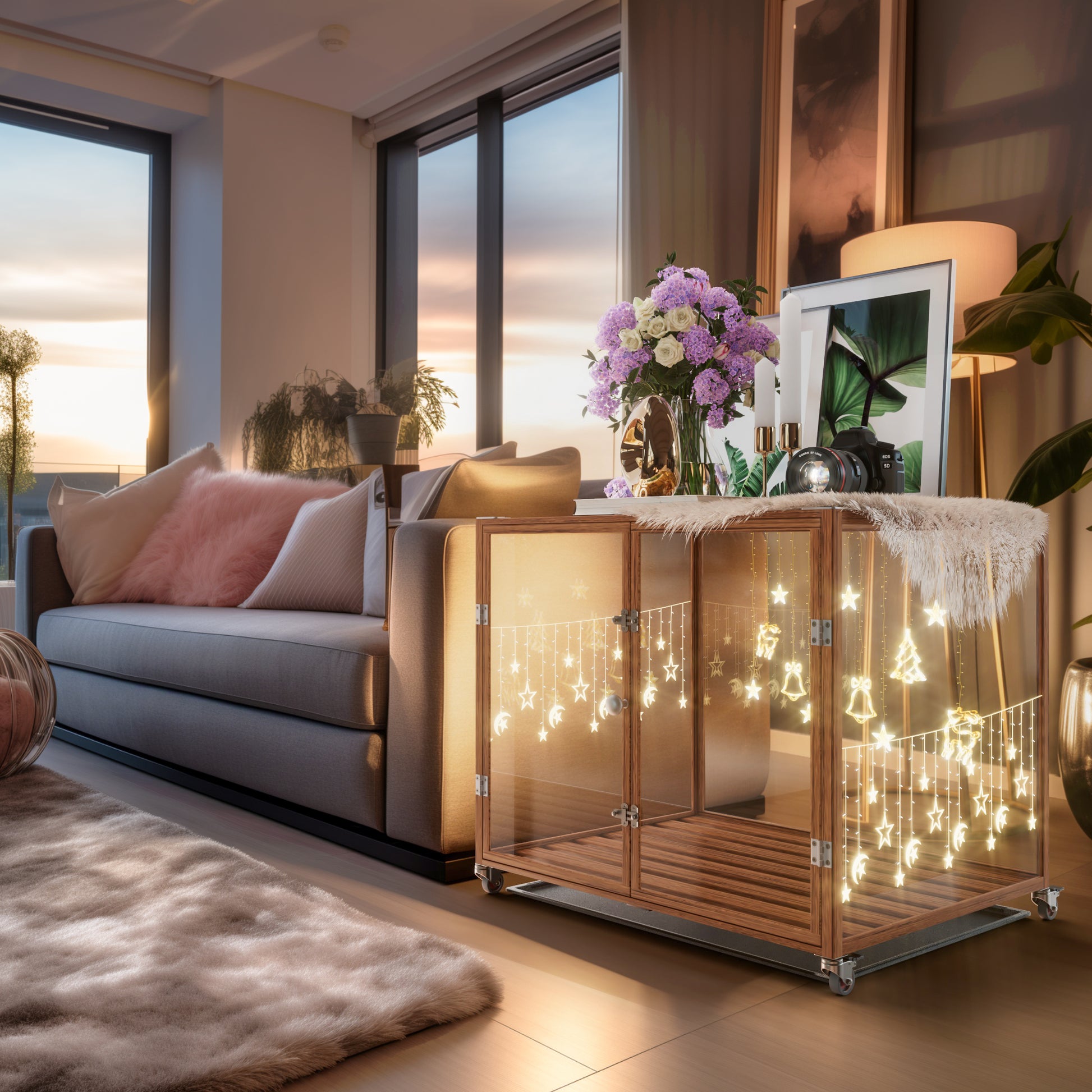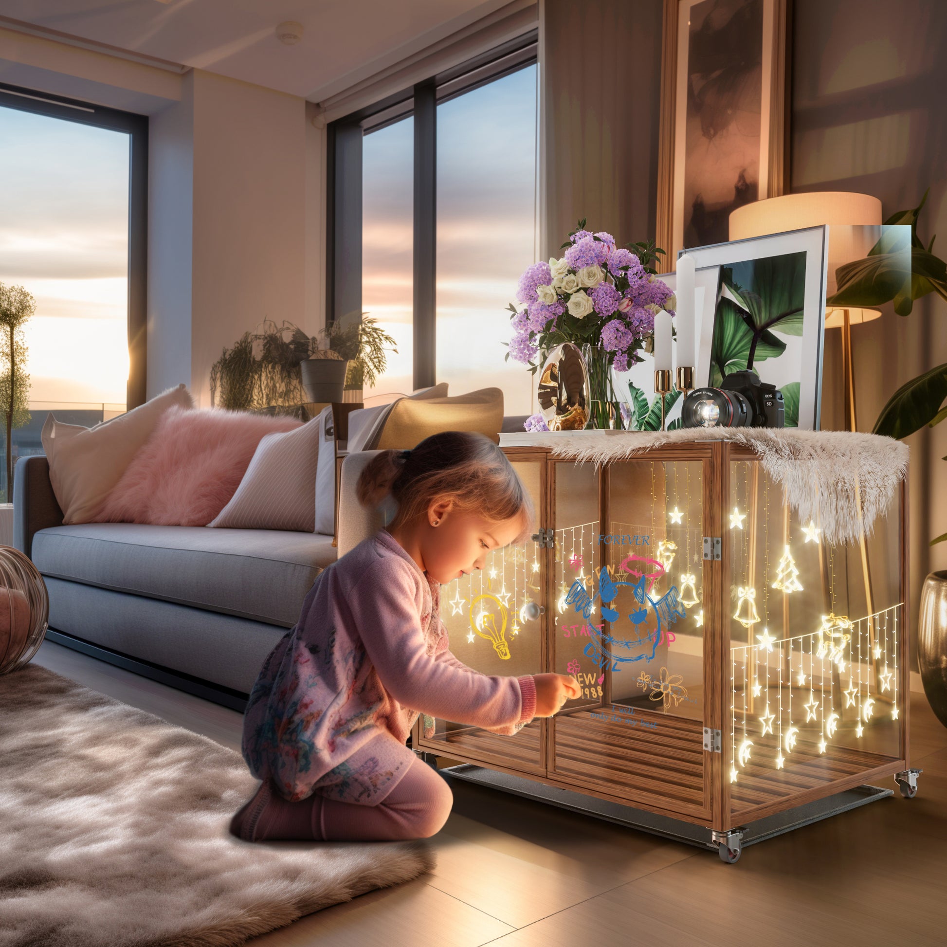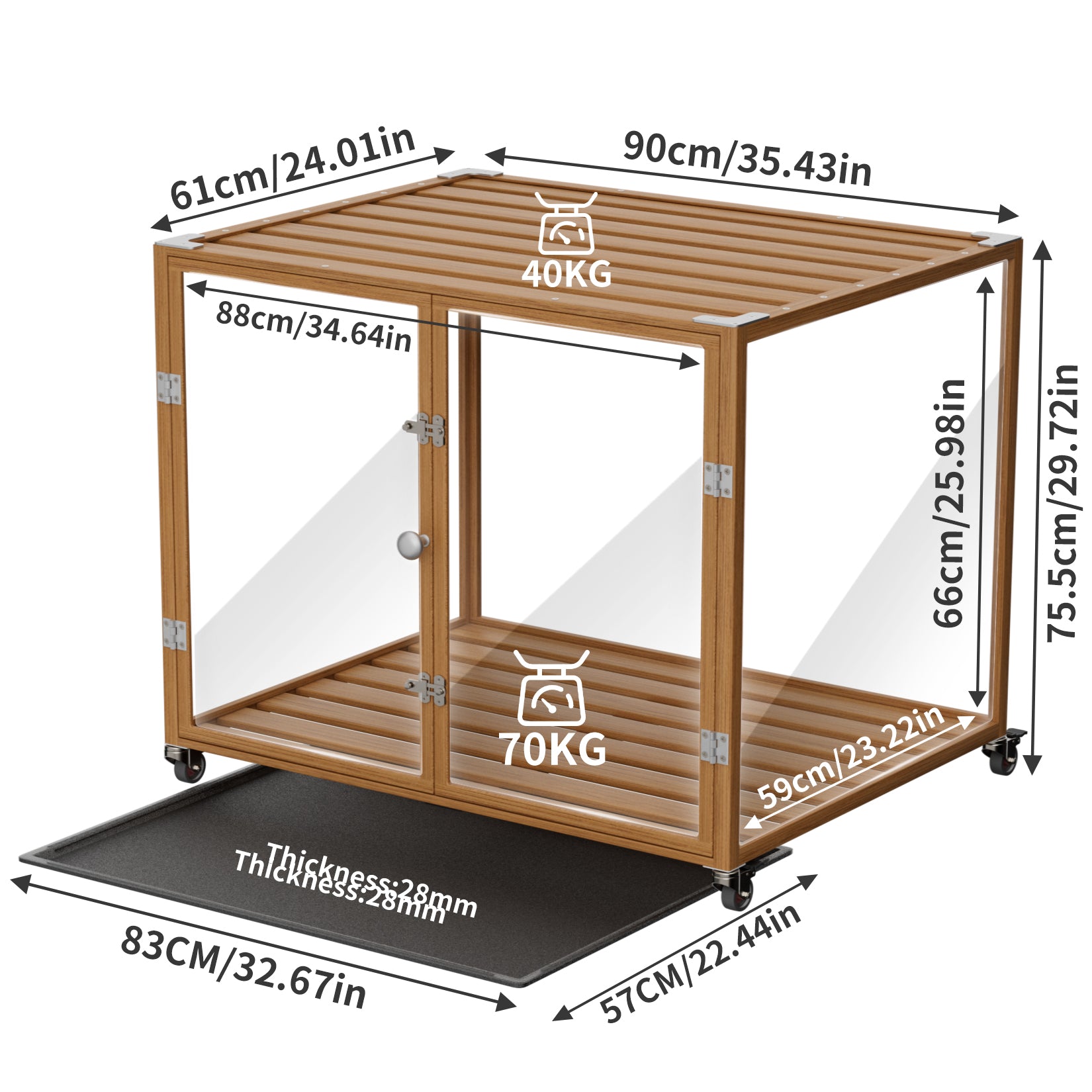 DIY Stylish Pet Cage For Dogs - Our new design pet cage are available in three sizes option, M size (29.92x23.03x26.18 inches), L size (35.43x24.01x29.72 inch) and XL size (41.73x26.96x32.28 inches), large interior space for small to large dog breeds, cats, it provides a safe and secure spot for pets to stand, turn around, lie down comfortably, the perfect blend of wood grain aluminum frame with clear tempered glass, it boasts a minimalist look, fits for most home styles, the surface enables you and your kids DIY painting or led fairy lights on the top for added an ambiance, giving a more inviting home for pets, easier to wipe clean with a cloth