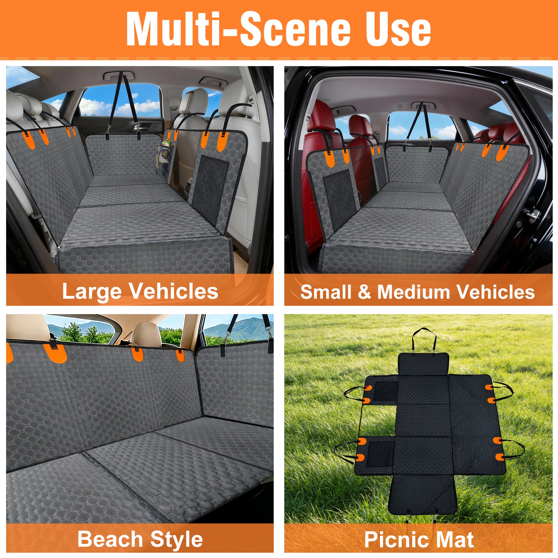 【Backseat Cover with Side Flaps】Includes foldable side flaps that not only protects your dogs from falling down but also prevent scratches, spills, and dirt from damaging your vehicle's interior, with convenient zippers for different dog sizes, especially elder dogs to get in and out of the car effortlessly, easily transform into a dog hammock for play and relaxation during long trips, or a protective barrier to keep the backseat clean and free from dirt, fur, slobber and scratches, makes cleaning up much simpler