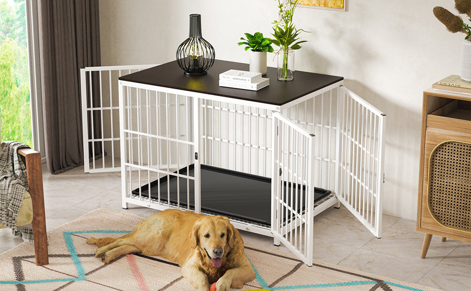 【Durable Dog Kennel】The pet dog crate is well crafted from thicker heavy metal wires, which features high strength and durability than the thin wire, resistant to deform and destroy, rounded iron tubes design are more resistant to bite than thin ones, the top is made of solid MDF board with beautiful wood grain, supports a weight of 88lbs - 132lbs, water-based paint surface, wipes it clean easily