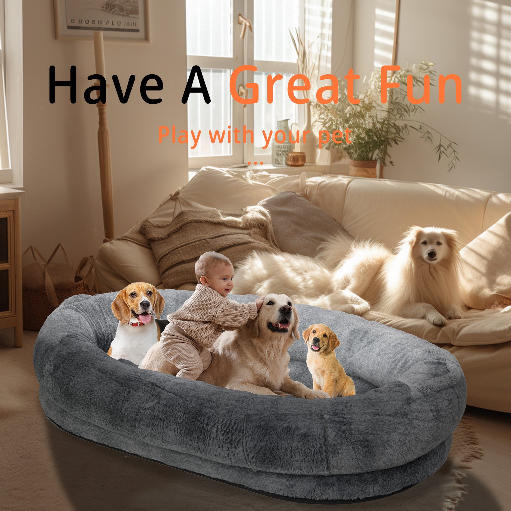 【Extra Large Human Dog Bed】Our dog bed size measures 66.92x43.3x13.77inch, extra large size can accommodate 2-3 medium-sized dogs or one person can rest on the bed with the pet and enjoy relaxing time with your pet, it would be a good choice to place it in the living room, bedroom or study