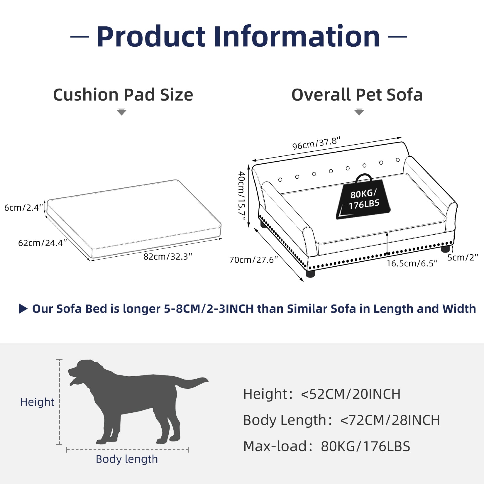 Large Spacious Pet Sofa - Our pet sofa bed has a more spacious space, 5-8cm longer and wider compared to others on the market, helps prevent discomfort, enables your pets to snooze, curl up or stretch out comfortably, with backrest and armrest for good support, giving a sense of security, the sponge cushion meticulously offering excellent comfort, which is strongly attached to the frame with magic tape, it won’t slide down even when the dogs jump on the sofa, the XL size will be the optimal choice for you if you have a middle-large dog